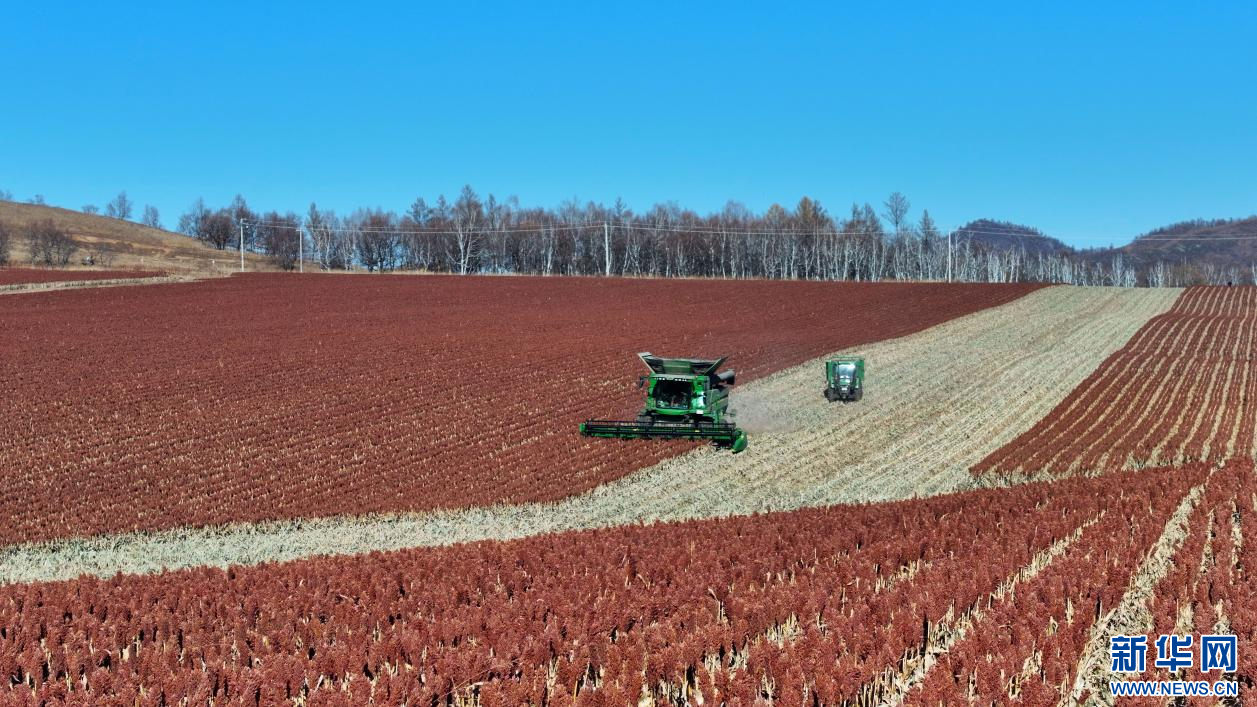 ??10月22日,在內(nèi)蒙古自治區(qū)呼倫貝爾農(nóng)墾綽爾河農(nóng)牧場有限公司田間,農(nóng)機手駕駛大型收割機收割高粱。新華網(wǎng)發(fā)(韓穎群 攝)
