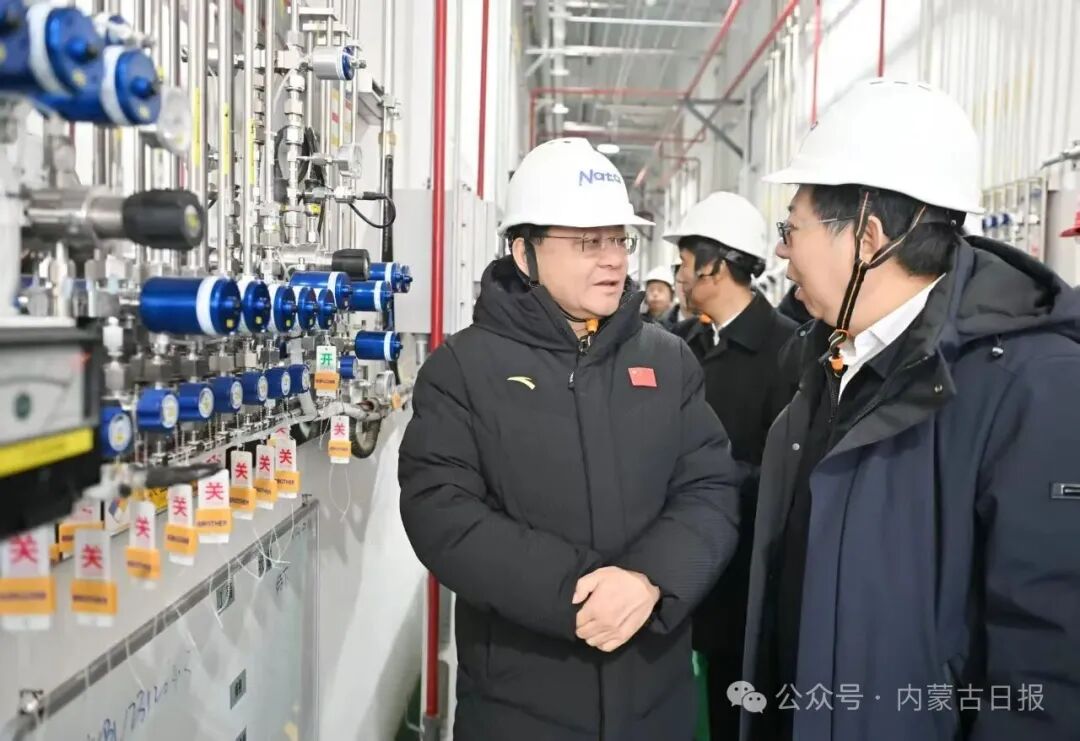 12月2日,自治區(qū)黨委書記王偉中在南大光電(烏蘭察布)有限公司察看高純電子級(jí)三氟化氮生產(chǎn)情況。草原云·內(nèi)蒙古新聞網(wǎng)記者 馬建兵 攝