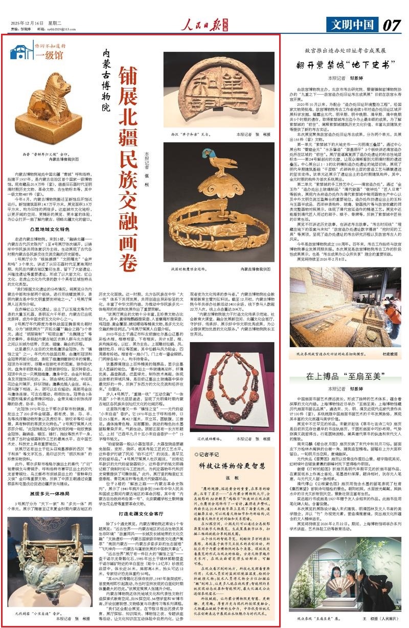 12月16日,《人民日報海外版》刊發(fā)《內(nèi)蒙古博物院 鋪展北疆民族交融畫卷》,報道內(nèi)蒙古自治區(qū)首個國家一級博物館今年6月搬遷至新館后開館試運行。新館建筑面積14.7萬平方米,展覽面積3.9萬平方米,均為舊館的兩倍多。這座城市文化地標,以更開闊的空間、更精彩的展覽、更豐富的體驗,為公眾打開一扇了解內(nèi)蒙古、領(lǐng)略北疆文化的窗口。