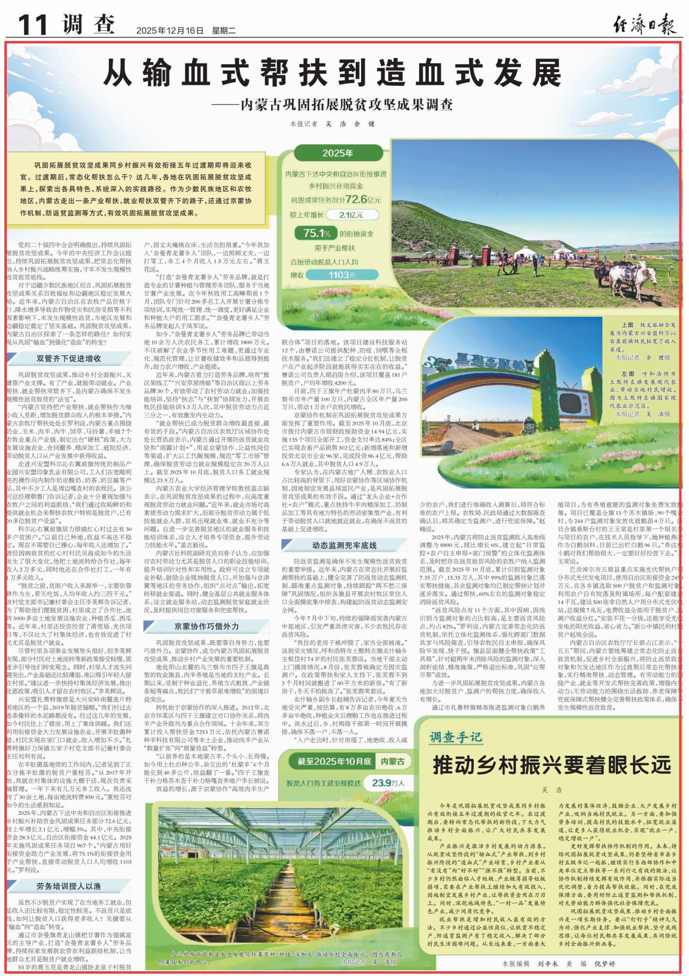 2025年12月16日,《經(jīng)濟日報》第11版刊發(fā)題為《從輸血式幫扶到造血式發(fā)展——內蒙古鞏固拓展脫貧攻堅成果調查》的文章,報道了鞏固拓展脫貧攻堅成果同鄉(xiāng)村振興有效銜接五年過渡期即將迎來收官。作為少數(shù)民族地區(qū)和農(nóng)牧地區(qū),內蒙古走出一條產(chǎn)業(yè)幫扶、就業(yè)幫扶雙管齊下的路子,還通過京蒙協(xié)作機制、防返貧監(jiān)測等方式,有效鞏固拓展脫貧攻堅成果。