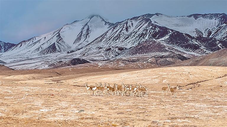 冬日,國家二級保護(hù)野生動(dòng)物藏原羚在甘肅省阿克塞縣阿勒騰鄉(xiāng)哈爾騰草原活動(dòng)覓食。新華社發(fā)