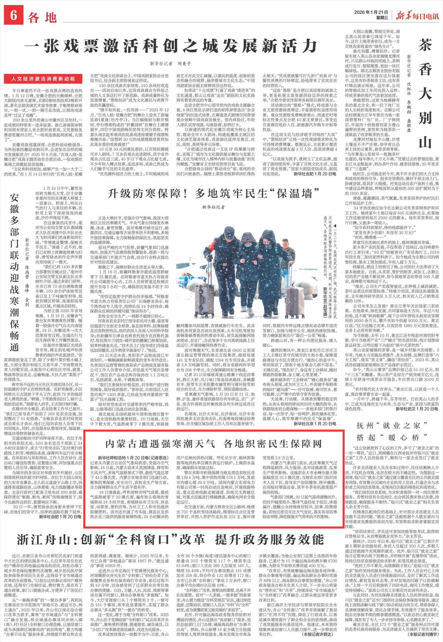 2026年1月21日《新華每日電訊》第6版刊發(fā)了《內(nèi)蒙古遭遇強(qiáng)寒潮天氣 各地織密民生保障網(wǎng)》的文章,報(bào)道了內(nèi)蒙古迎來(lái)大范圍降溫、降雪和大風(fēng)天氣,多地氣溫?cái)嘌率较碌?,最低氣溫達(dá)零下44.5攝氏度。各地各部門(mén)迅速行動(dòng),聚焦防寒保暖、安全出行、農(nóng)牧業(yè)生產(chǎn)等方面,全力保障群眾生產(chǎn)生活平穩(wěn)有序。