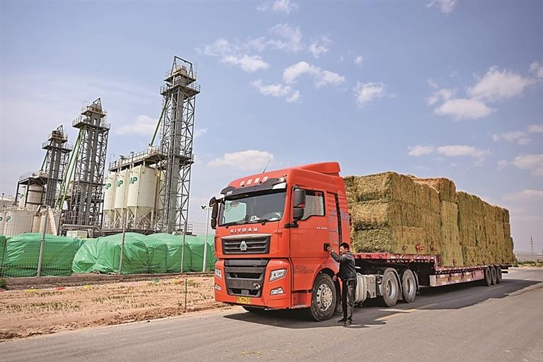 在內(nèi)蒙古赤峰市阿魯科爾沁旗,滿載牧草的貨車準(zhǔn)備啟程。新華社發(fā)