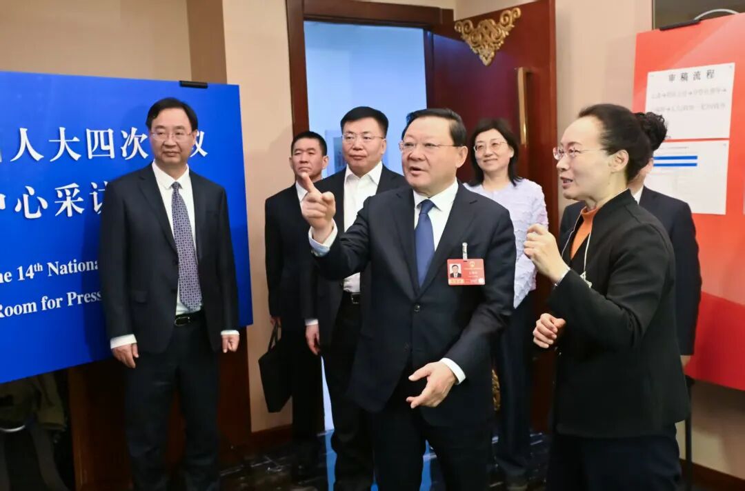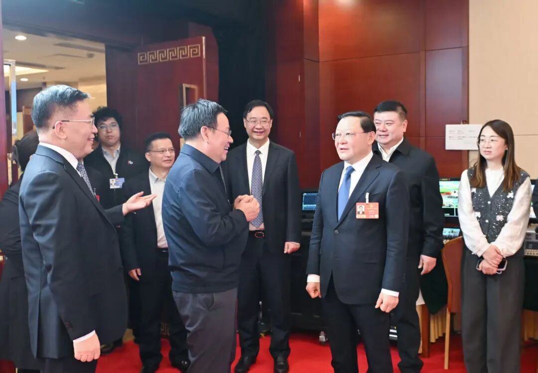 3月6日,自治區(qū)黨委書記、人大常委會(huì)主任王偉中,自治區(qū)黨委副書記、自治區(qū)人民政府主席包鋼在內(nèi)蒙古日報(bào)社兩會(huì)報(bào)道工作間與記者代表親切交流,詳細(xì)了解宣傳報(bào)道情況。草原云·內(nèi)蒙古新聞網(wǎng)記者 馬建兵 攝