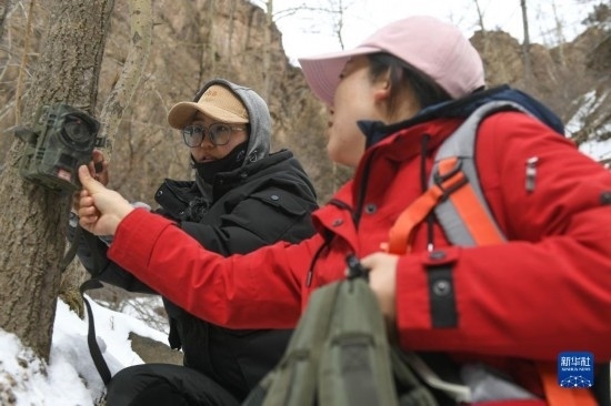 2月20日,在內蒙古賀蘭山國家級自然保護區(qū),工作人員阿麗瑪(左)和徐皓在布設紅外相機。