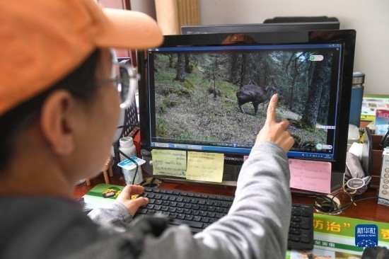 2月20日,在內蒙古賀蘭山國家級自然保護區(qū)管理局,工作人員阿麗瑪展示紅外相機拍攝到的國家一級保護動物馬麝。