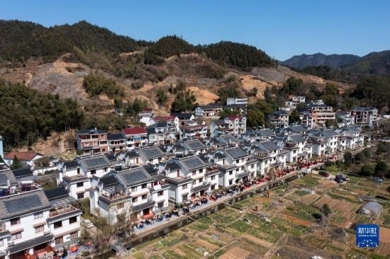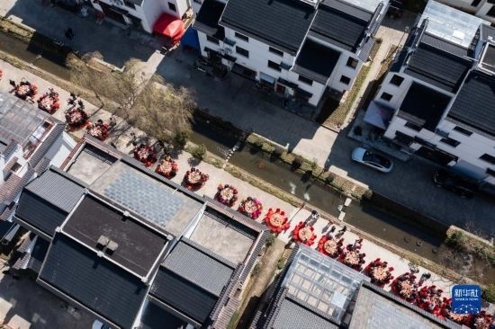 2月26日空中俯瞰蓮花鎮(zhèn)戴家新村的百家宴(無(wú)人機(jī)照片)。