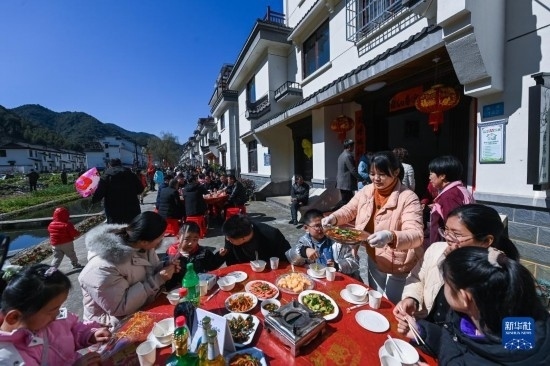 2月26日,游客們?cè)谏徎ㄦ?zhèn)戴家新村的百家宴上品嘗特色美食。