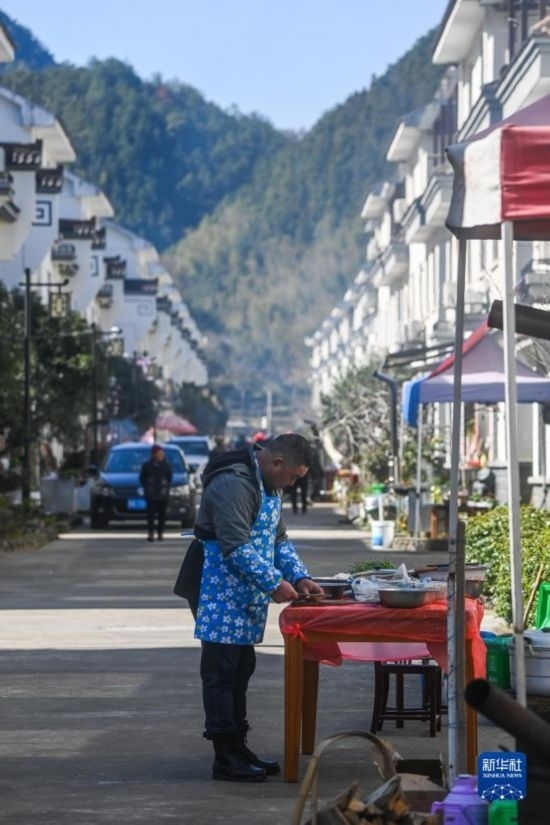 2月26日,蓮花鎮(zhèn)戴家新村的村民在新居門前烹飪農(nóng)家菜,為百家宴做準(zhǔn)備。