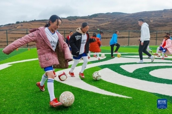 圖為在“玫瑰夢想球場”上,瓦吾小學(xué)的女足隊員們在教練曹國棟(前)的帶領(lǐng)下訓(xùn)練(2023年3月3日攝)。