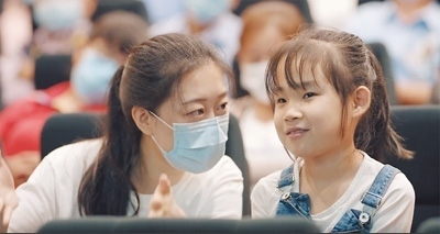 “光明影院”學生志愿者正在與小朋友交流。