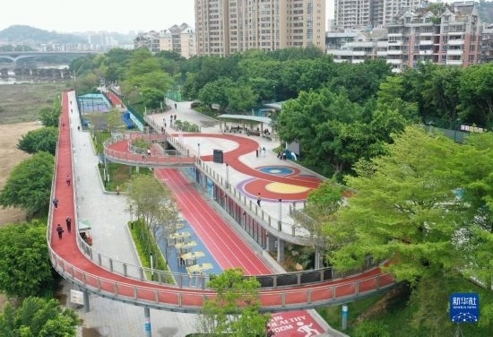 4月24日拍攝的福州市鼓樓區(qū)西河智慧體育公園內(nèi)智慧跑道、智慧健身器材及健身驛站等(無人機(jī)照片)。