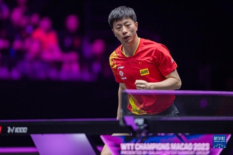 2023年4月22日,馬龍?jiān)诒荣愔?。?dāng)日,在澳門塔石體育館舉行的2023世界乒乓球職業(yè)大聯(lián)盟(WTT)澳門冠軍賽男子單打半決賽中,中國選手馬龍以4比1戰(zhàn)勝法國選手艾利克斯·勒布倫,晉級決賽。新華社記者 張金加攝