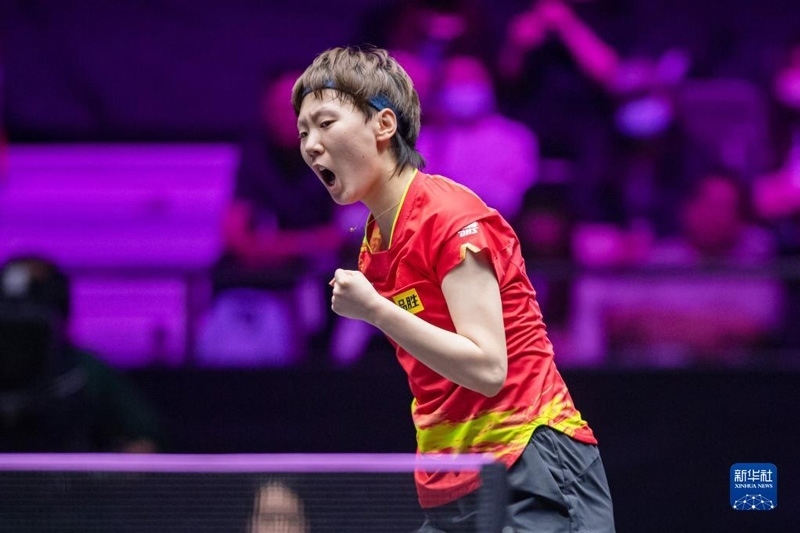 2023年4月15日,孫穎莎慶祝比賽獲勝。當(dāng)日,在河南新鄉(xiāng)舉行的世界乒乓球職業(yè)大聯(lián)盟(WTT)新鄉(xiāng)冠軍賽女單決賽中,中國選手孫穎莎以4比1戰(zhàn)勝隊(duì)友王藝迪,奪得冠軍。新華社記者 李嘉南攝