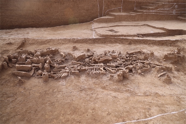 在“郭城”東南拐角處,發(fā)現(xiàn)一條殷墟時(shí)期的大型祭祀溝,長(zhǎng)達(dá)19.36米,溝內(nèi)堆疊了3層人骨及動(dòng)物骨骼,初步清理出完整的人骨3具,以及肢解的牛骨、豬骨、馬骨、鳥骨等,經(jīng)動(dòng)物考古學(xué)家辨認(rèn)至少分屬17個(gè)動(dòng)物個(gè)體??脊趴碧竭€發(fā)現(xiàn)不同時(shí)期的道路遺跡穿過(guò)城壕,為探討洹北商城內(nèi)外部交通路網(wǎng)提供了重要線索。