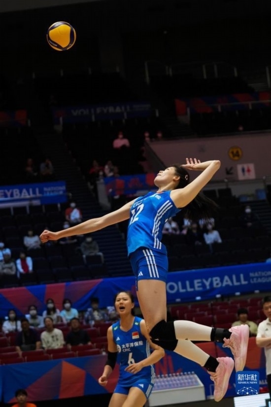 6月2日,中國隊球員袁心玥(中)在比賽中扣球。新華社記者 張笑宇 攝