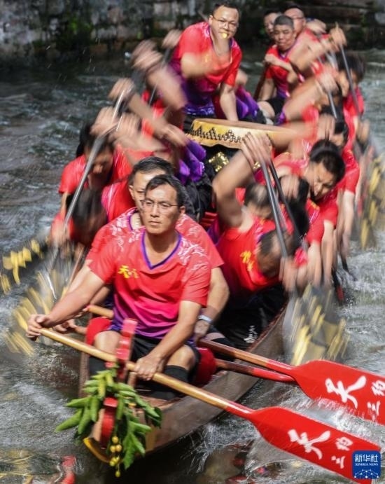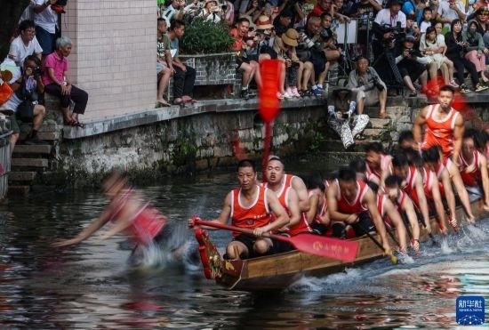 龍船漂移時,船頭船尾的舵手專門負(fù)責(zé)入彎出彎時的線路和速度控制(6月22日攝)。