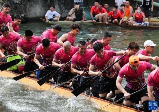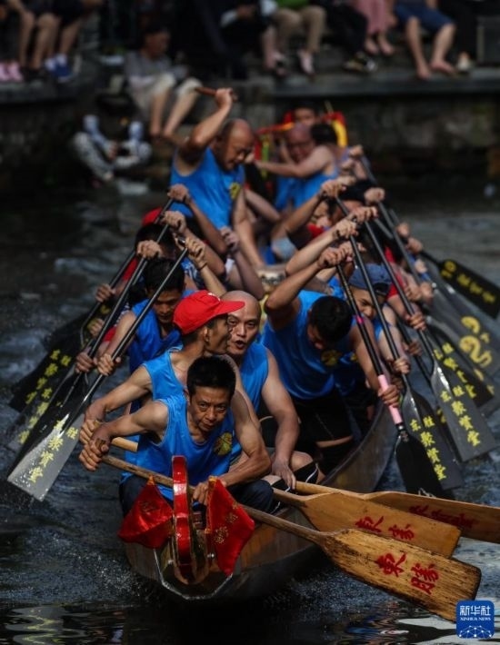 6月22日,“扒仔”(槳手)在佛山疊滘端午龍船漂移賽上奮力揮槳。