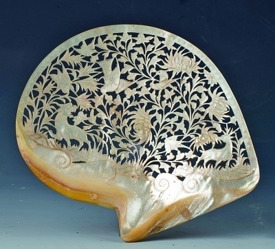 雜項(xiàng)包括景泰藍(lán)、錫器、銀器、竹編、草編、木雕、貝殼鏤雕、泥塑等多個(gè)門(mén)類(lèi),名品與新品琳瑯滿(mǎn)目。1951年至1952年,常沙娜在林徽因的指導(dǎo)下設(shè)計(jì)的北京景泰藍(lán)“和平鴿紋盤(pán)”“飛天紋盤(pán)”等作品,不僅富有敦煌特色,而且探索了傳統(tǒng)工藝設(shè)計(jì)的轉(zhuǎn)型之路。四川自貢名家龔玉璋的竹絲扇工藝精湛,圖像富有文人雅趣。廣州珍珠殼鏤雕成對(duì)展示,造型雅致,色澤瑩潤(rùn),工藝精細(xì),裝飾華美。來(lái)自天津、潮州等地的木雕糕模造型喜慶,寓意吉祥。江蘇無(wú)錫惠山泥人的代表作“大阿?!蔽⑿F(tuán)坐,迎祥納福。造型小巧的陜西泥哨多為黑地彩繪,形象質(zhì)樸,神情生動(dòng),上有兩個(gè)小孔,吹之可發(fā)聲。