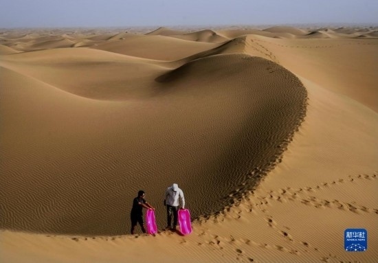 游客在新疆喀什地區(qū)麥蓋提縣N39°沙漠旅游景區(qū)內準備體驗滑沙(9月7日攝)。