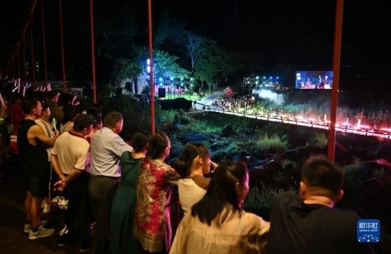 9月16日,觀眾在舞臺附近的一座橋上觀看表演。