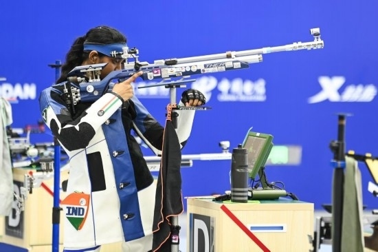 2023年7月29日,印度隊選手瓦拉里萬以252.5環(huán)的總成績獲得第31屆世界大學(xué)生夏季運(yùn)動會女子10米氣步槍冠軍。新華社記者 曹祎銘 攝