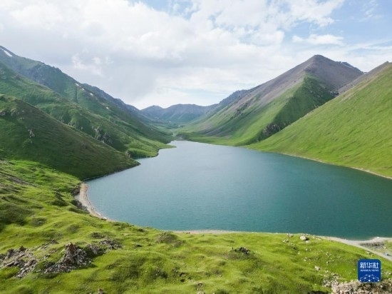 這是和靜縣一處高山湖泊景觀(7月5日攝,無人機全景照片)。