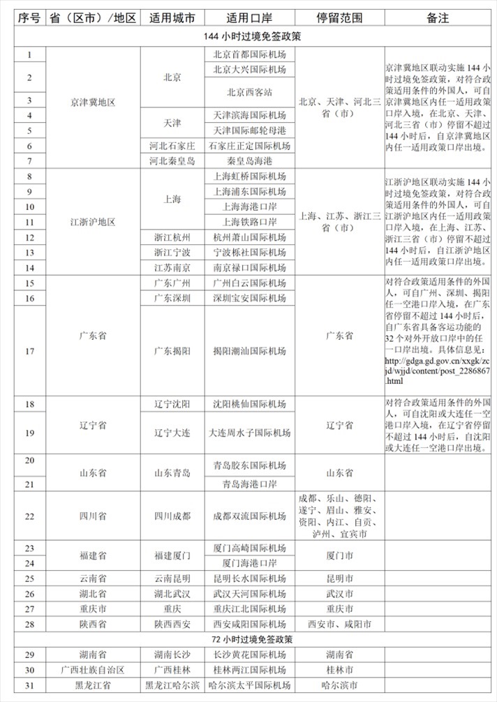 如外國人符合上述條件,可向我國20個(gè)城市的邊檢機(jī)關(guān)提出辦理144小時(shí)過境免簽申請,或向3個(gè)城市的邊檢機(jī)關(guān)提出辦理72小時(shí)過境免簽申請,其他城市暫未實(shí)施該項(xiàng)政策。
