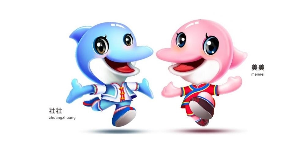 首屆學(xué)青會(huì)吉祥物“壯壯”“美美”,是一對活潑律動(dòng)的海豚形象,以中華白海豚為原型創(chuàng)作,搭配壯錦和民族服飾,凸顯廣西的民族特色和地域風(fēng)格。