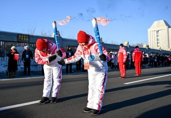 2月3日,在內(nèi)蒙古呼倫貝爾市滿洲里國門景區(qū),火炬手包玲玲(右)和錢卓在火炬?zhèn)鬟f活動(dòng)中。新華社記者 連振 攝