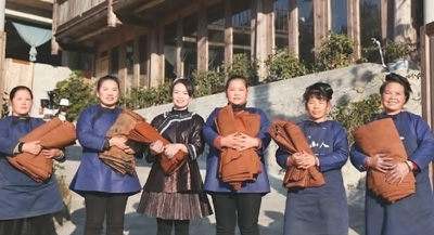 非物質文化遺產傳承、文化產品開發(fā),使鄉(xiāng)村文化在鄉(xiāng)村振興建設中發(fā)揮更大作用,也讓鄉(xiāng)村文化遺產更好地留存下來、傳承下去。非遺傳承人楊成蘭(左三)與織娘一起展示手作侗布。受訪者供圖本文圖片除署名外均由朱玉芳攝