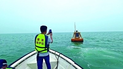 廣西合浦儒艮國家級自然保護區(qū)工作人員檢查海洋哺乳動物水下聲學(xué)監(jiān)測浮標。