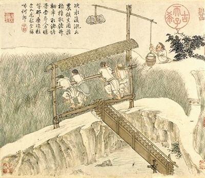 通過品讀繪畫中的水利機具發(fā)展變化,不僅可以直觀感受勞動技術(shù)的進步,還有助于從古人識水、用水的智慧中汲取養(yǎng)分。