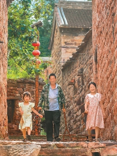 在柴關(guān)鄉(xiāng)石門溝村,街巷地面全由紅石板鋪成,石板街道隨地勢起伏,陡坡處壘砌有石板臺階。圖為村民走過石門溝村的古巷。邵玉姿、高儒森攝