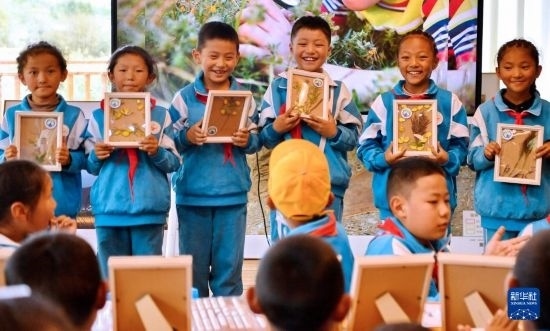 8月15日,拉魯小學(xué)的學(xué)生在拉魯濕地國家級自然保護(hù)區(qū)管理局科普小教室里向大家展示優(yōu)秀植物標(biāo)本。