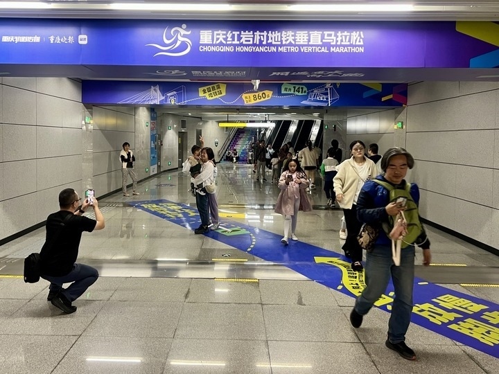 國(guó)慶前夕,這里剛舉辦了一場(chǎng)垂直馬拉松。賽事帶來(lái)品牌效應(yīng),前來(lái)打卡的人群絡(luò)繹不絕?!按怪瘪R拉松一般在摩天大樓里舉辦,如今地鐵站里居然能跑馬拉松,重慶總是能給游客帶來(lái)驚喜。”來(lái)自河北的游客張楠說(shuō)。