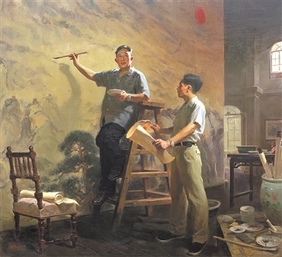 正在舉辦的第十四屆全國(guó)美術(shù)作品展覽進(jìn)京作品展上,撲面而來的藝術(shù)形象是腳踏中華大地的各族人民,是中國(guó)近現(xiàn)代文化史上的先賢圣哲,是和我們一道相擁而立的堂堂中國(guó)人。這些形象剛強(qiáng)勇毅,如潮如云,傳遞著眾志成城的精神力量,扣動(dòng)人心。譬如,呂鵬《山河頌》,以濃郁的色調(diào),再現(xiàn)傅抱石、關(guān)山月兩位前輩創(chuàng)作《江山如此多嬌》的情景,鐫刻新中國(guó)美術(shù)史上重要一幕;鄔大勇《我心中的英雄》塑造了畫家少年時(shí)代的英雄偶像——錢學(xué)森等一代科學(xué)家。還有許多氣勢(shì)宏大的創(chuàng)作,它們既是社會(huì)生活、時(shí)代精神的藝術(shù)載體,又是美術(shù)工作者面對(duì)歷史、面對(duì)人民的激情熔爐。這些作品以人民形象為根基,深植時(shí)代沃土,構(gòu)成歷史與現(xiàn)實(shí)相輝映的史詩(shī)畫卷。