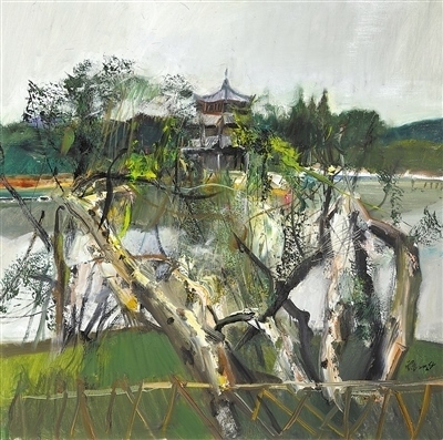 油畫《臨海東湖》,作者楊參軍。