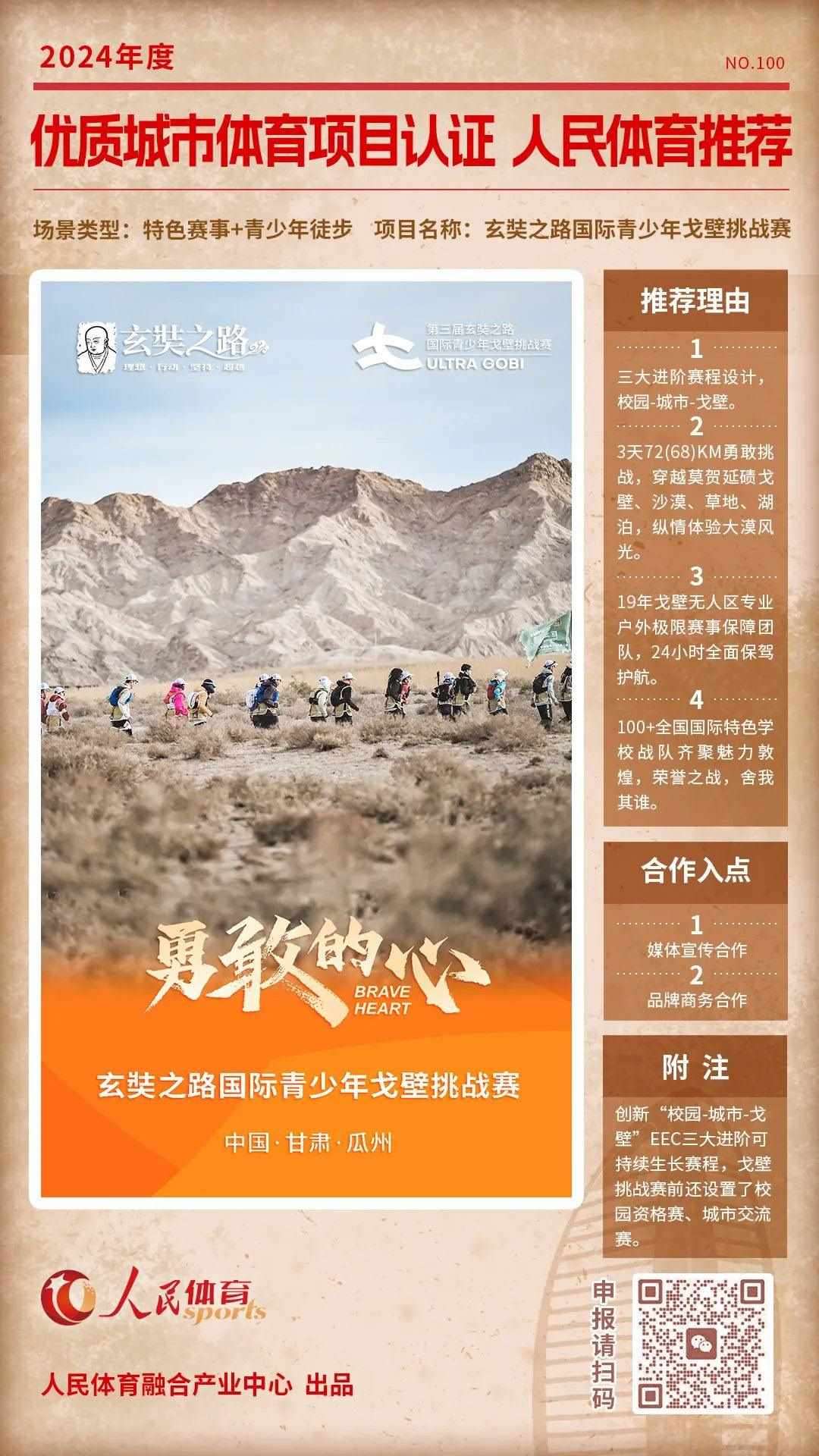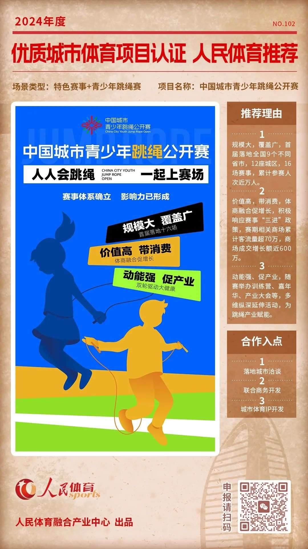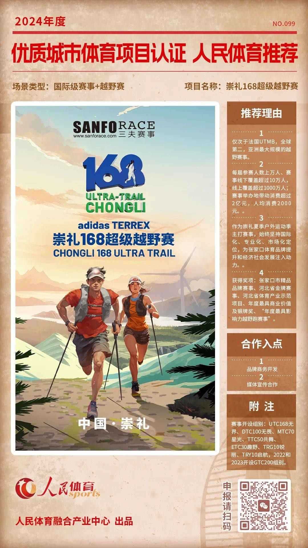 “優(yōu)質(zhì)體育賽事及活動(dòng)認(rèn)證推薦計(jì)劃”是人民體育“城市體育產(chǎn)業(yè)高質(zhì)量發(fā)展計(jì)劃”的重要組成部分,人民體育一直致力于攜手權(quán)威機(jī)構(gòu)、組織單位等聯(lián)合推薦優(yōu)質(zhì)項(xiàng)目,項(xiàng)目類型包括且不限于賽事、活動(dòng),也涵蓋產(chǎn)品與服務(wù)類別。旨在以更客觀的角度,展示在體育產(chǎn)業(yè)發(fā)展中有所創(chuàng)新,有所價(jià)值的項(xiàng)目,促進(jìn)多方相互了解,融合發(fā)展。