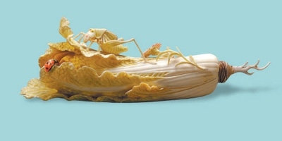細(xì)細(xì)端詳,白菜葉莖上,還飾有兩朵小花,一朵含苞,一朵盛放;菜葉與主體的結(jié)合部位,趴伏著一只翠色蟈蟈,蟈蟈雙腿一屈一蹬,正盡情吮吸白菜鮮美的汁水;一只瓢蟲一旁靜臥,須角隱現(xiàn),似乎也在埋頭享用大餐。小花和小蟲的點(diǎn)綴,使得整個(gè)作品兼顧野趣和雅致,充滿生命的律動(dòng)與自然的和諧。