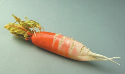 這根“蘿卜”長(zhǎng)約27厘米,重229克。根莖由上部的紅色漸變?yōu)橹胁康姆奂t和根部的白色,根須自然彎曲,葉片呈綠色。蘿卜上一只蟈蟈伸出前肢正由葉片爬向莖部,也顯得動(dòng)感十足。