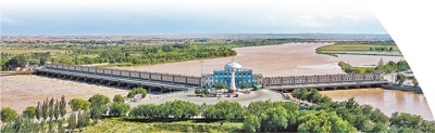登上三盛公水利樞紐觀景平臺,眼前豁然開朗。黃河宛如一條巨龍,自天際蜿蜒而來,在攔河閘壩的疏導和調(diào)控下,水流變得平緩有序。在這里,黃河被一分為二,一條仍沿主河道逶迤東去,一條則被引入由人工開鑿的總干渠。