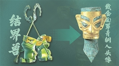 “卷鼻子”結(jié)界獸造型除了融合戴金面罩青銅人頭像、青銅大面具的元素外,還借鑒青銅縱目面具、三星堆青銅鷹形鈴的特點。