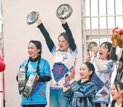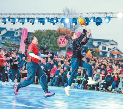 場(chǎng)上,身著特色服飾的婦女們或懷抱籃球健步如飛,或三五成群笑鬧爭(zhēng)球;場(chǎng)邊,蘆笙悠揚(yáng),錦雞舞、銅鼓舞輪番上陣,十二道攔門酒的醇香與觀眾的喝彩匯成獨(dú)特的苗味交響。傳統(tǒng)頭帕與運(yùn)動(dòng)發(fā)帶相得益彰,古法藍(lán)染與熒光記分屏互相映襯,這場(chǎng)縣城里的活力賽事,流淌著千年苗韻,躍動(dòng)著時(shí)代脈搏。