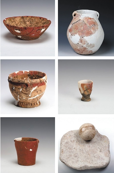 外圍人工土臺一般用純凈的黃褐色黏土堆筑而成,大多呈東西向的長方形。土臺上目前已揭露房址2處、灰坑23座、器物坑28座、高等級墓葬3座。墓葬的墓坑呈長方形,東西向或南北向。隨葬陶器較多,均在20件以上,主要有平底罐、圈足罐、大口盆等,有的墓葬還隨葬石器。從隨葬品的數量看,等級較高,說明在稻作農業(yè)經濟的支撐下,距今9000年左右,上山文化社會較早地出現了社會分化。