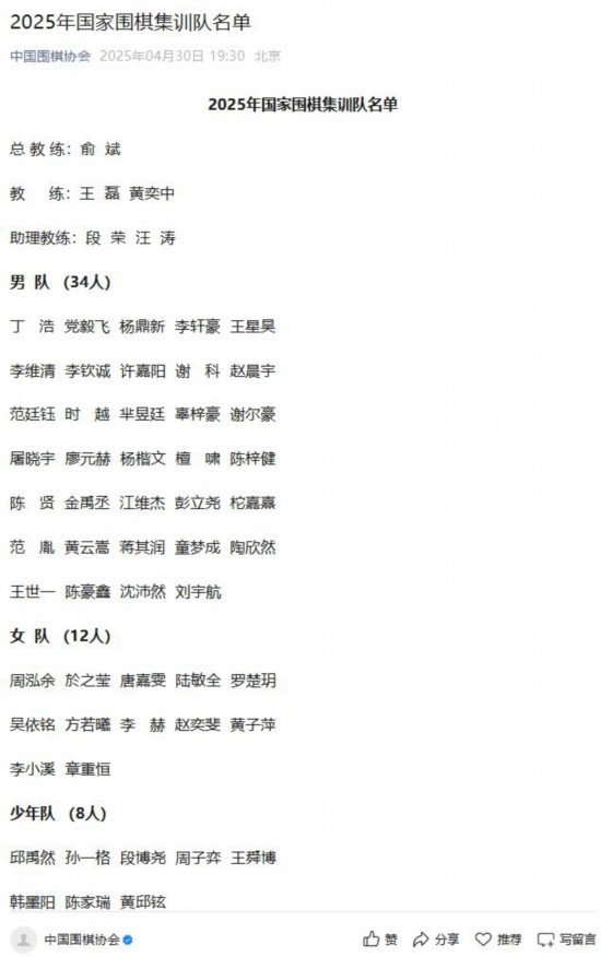 據(jù)國家圍棋集訓(xùn)隊(duì)選拔小組負(fù)責(zé)人介紹,根據(jù)《國家圍棋集訓(xùn)隊(duì)運(yùn)動員入隊(duì)標(biāo)準(zhǔn)》,報(bào)中國圍棋協(xié)會批準(zhǔn),共有54人入選2025屆國家集訓(xùn)隊(duì)。男隊(duì)由王星昊、丁浩、黨毅飛、楊鼎新、李軒豪、李維清、李欽誠等34名棋手組成;女隊(duì)有12人,包括周泓余、於之瑩、唐嘉雯等。此外,國少隊(duì)還有8名棋手。國家圍棋集訓(xùn)隊(duì)的教練組由5人組成,俞斌擔(dān)任總教練,王磊、黃奕中擔(dān)任教練,段榮和汪濤任助理教練。