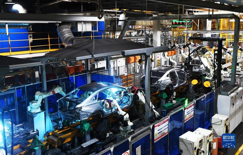 在重慶兩江新區(qū)的長安汽車兩江智能工廠,工業(yè)機(jī)器人在焊接車間的流水線上作業(yè)(2020年7月21日攝)。新華社記者 王全超 攝