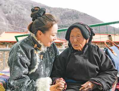 近日,全國人大代表、四川省馬爾康市老年養(yǎng)護院院長格西王姆(左)走訪鄉(xiāng)村,傾聽老人心聲。