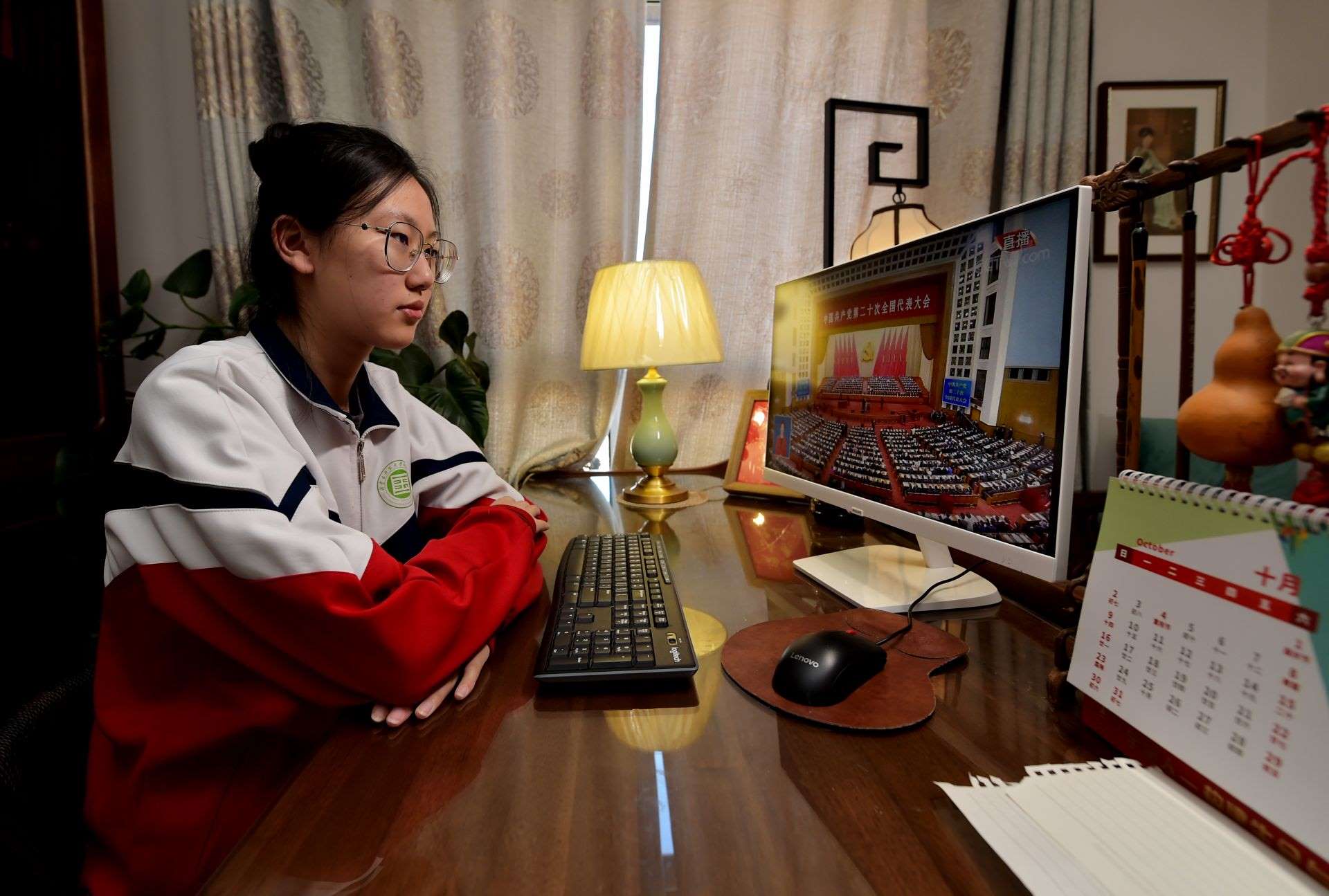 內(nèi)蒙古師范大學(xué)附屬第二中學(xué)的學(xué)生蒙納收看黨的二十大開幕會。本報(bào)記者馬建荃攝