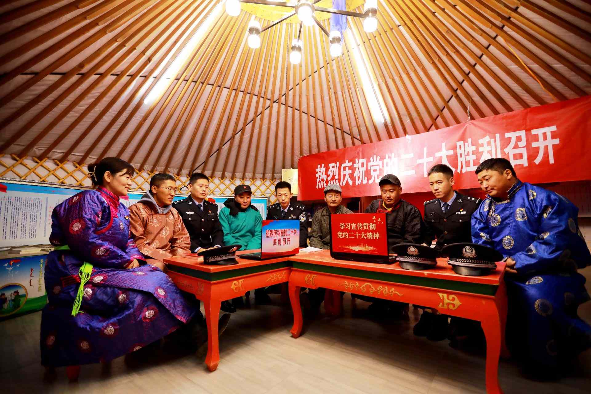 蘇尼特左旗邊境管理大隊(duì)民警與群眾一同收看黨的二十大開幕會。任利勇攝